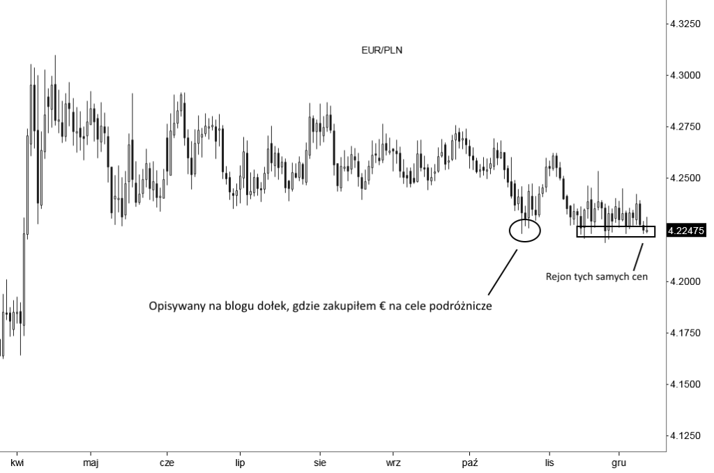 Wróćmy teraz do EUR/PLN, który jest przykładem, że czasem jednak nie ma czasu na czekanie. 😉 Tak jest kiedy się wyjeżdża i potrzeba waluty „na już”. Ja zimą ruszam pod palmy, bo nie lubię smogu, także zakupiłem spore ilości euro w celach podróżniczych jeszcze w październiku, by nie musieć kupować na ostatnią chwilę.