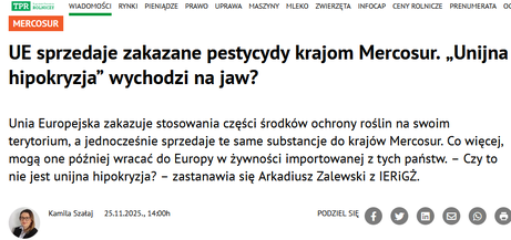 Druga sprawa to głębsze kwestie ekologii, całych ekosystemów wodnych i lądowych. W Mercosurze można używać masę niebezpiecznych dla ludzi i zwierząt substancji (m.in. toksycznych pestycydów, fungicydów czy herbicydów), zakazanych w UE bo są rakotwórcze, potrafią skazić wody gruntowe i zatruć całe lokalne ekosystemy, ekspozycja na nie powoduje ciężkie choroby układu krążenia itd. Czyli niby są za przyrodą, ale robią co innego.