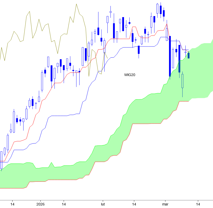 A jak wygląda sytuacja na naszym flagowym indeksie? Po lekkim tąpnięciu ceny próbują zmierzyć się z niebieską linią Kijun-sen, atakując ją od dołu.